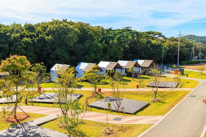 다도해상국립공원 해안과 맞닿아 바다 풍경과 몽돌 해변을 즐길 수 있는 소규모 국립공원 야영장